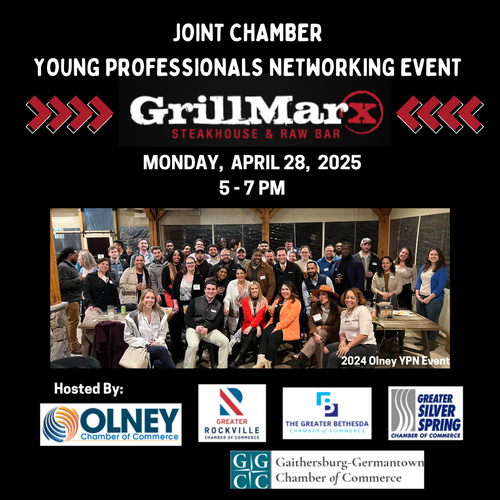 The Olney Chamber is excited to host the joint Young Professionals Network (YPN) Networking Mixer at GrillMarx Steakhouse & Raw Bar in Olney, MD. YPN is a platform designed to connect and support young professionals in their career development, offering them opportunities to expand their networks, gain valuable industry insights, and collaborate with peers across various fields. This event, in partnership with the Silver Spring, Gaithersburg-Germantown, Rockville, and Bethesda Chambers of Commerce, provides a unique opportunity for young professionals to meet, share ideas, and form lasting connections with like-minded individuals. Whether you’re looking to grow your career, share your expertise, or find new business opportunities, this mixer is the perfect environment to engage with the local professional community. Join us for an evening of networking and professional growth!