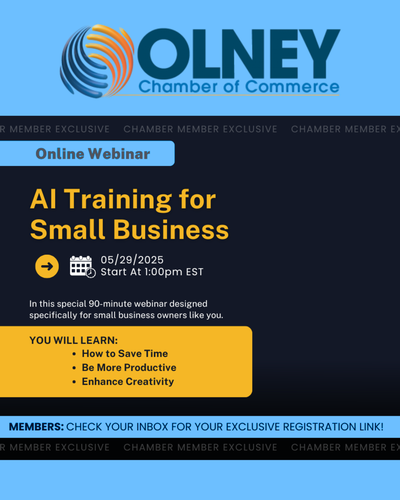 We’re excited to offer our Olney Chamber members an exclusive opportunity to elevate your business with cutting-edge AI knowledge at NO CHARGE!